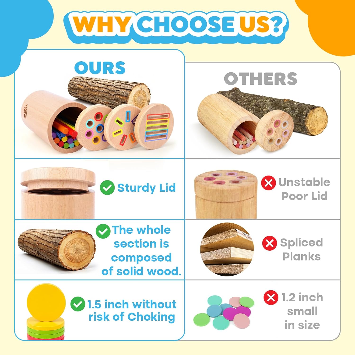 [Learning and Development Toddler Toys]: A wooden tube with 3 types of lids, 16 colorful sticks, 14 popsicle sticks and 10 discs form a classic gift package for early education. Develop baby’s color cognition, spatial concepts, imagination and innovation, and help control fine movements and sense of direction. The separate lid is for the baby to open with his hands, which can be delivered and learned to store, and is also conducive to the permanentness of the object.